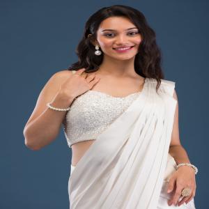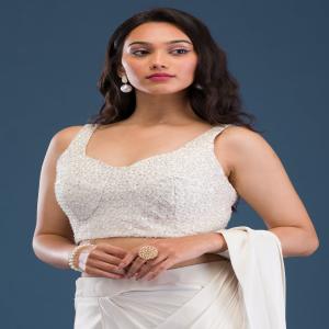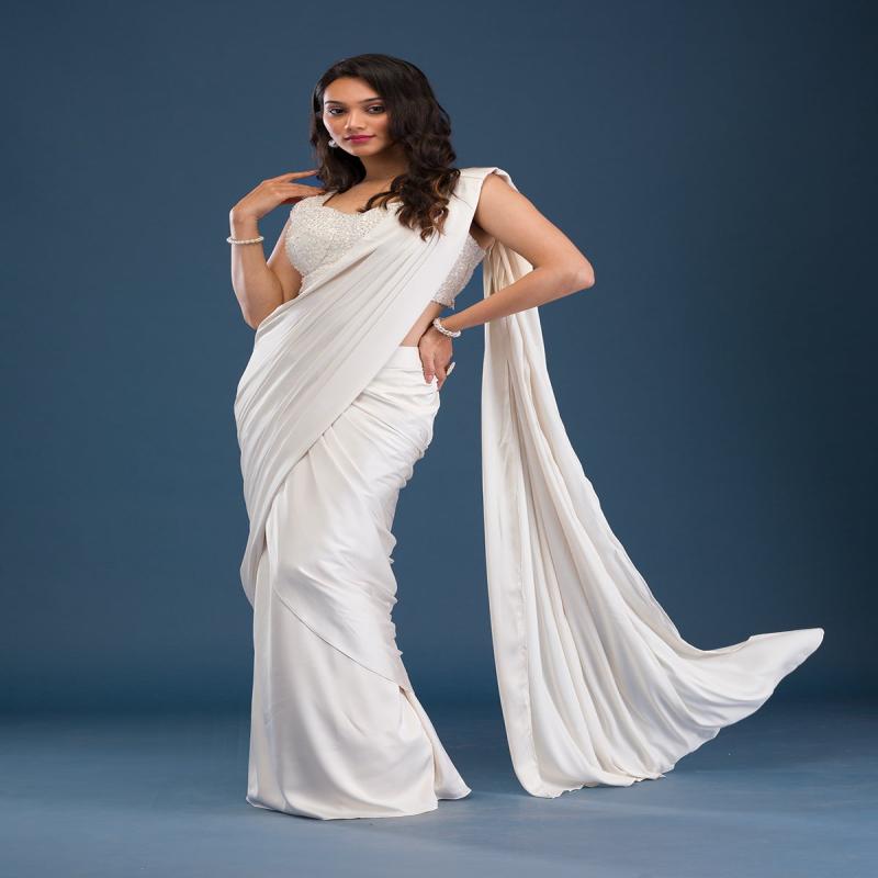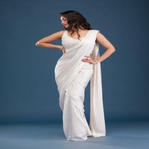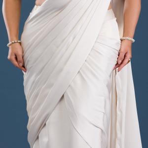 Embrace the splendor of Koskii’s ivory satin saree, where luxurious fabric meets mesmerizing cutdana embroidery to create a masterpiece of ethnic elegance. This saree is a celebration of spirited charm and vibrant fashion, perfect for the woman who adores standing out with grace and vivacity. Each drape promises a smooth, radiant glow that mirrors your lively personality, making it a splendid choice for any grand affair or stylish gathering.