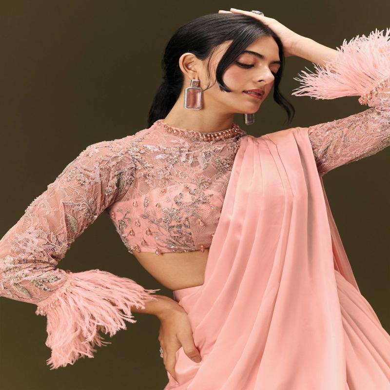 Baby Pink Ready To Wear Satin Saree With High Neck Full Sleeve Blouse