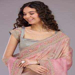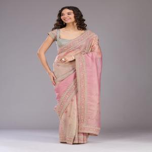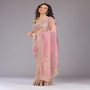 Baby Pink Saree in Organza fabric. The Saree is elevated with Sequins embroidery. It comes with an Unstitched blouse. Comes with the Koskii promise of premium quality.