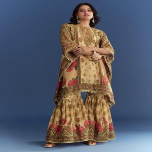 Light and ethereal, this beige kaftaan kurta stuns with mirror and sequins work, floral printed sharara, and festive elegance in every layer.