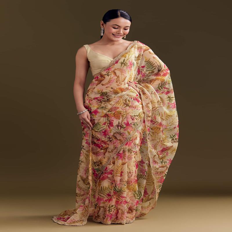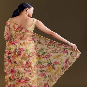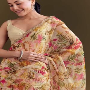 In a fresh beige yellow tone, this organza saree comes with dainty floral prints and embellished borders. Awarded as the Most Trusted Brand, we're delivering styles you love, just as promised.