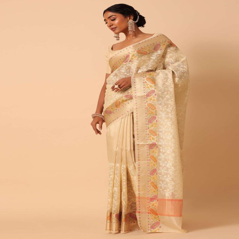 Beige Saree In Kora Silk With Floral Motif Multicolor Thread Work And Unstitched Blouse Piece