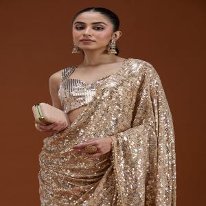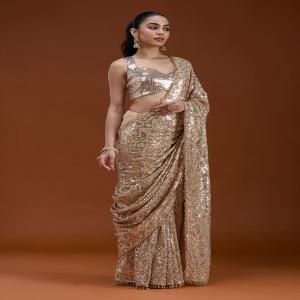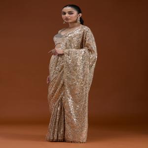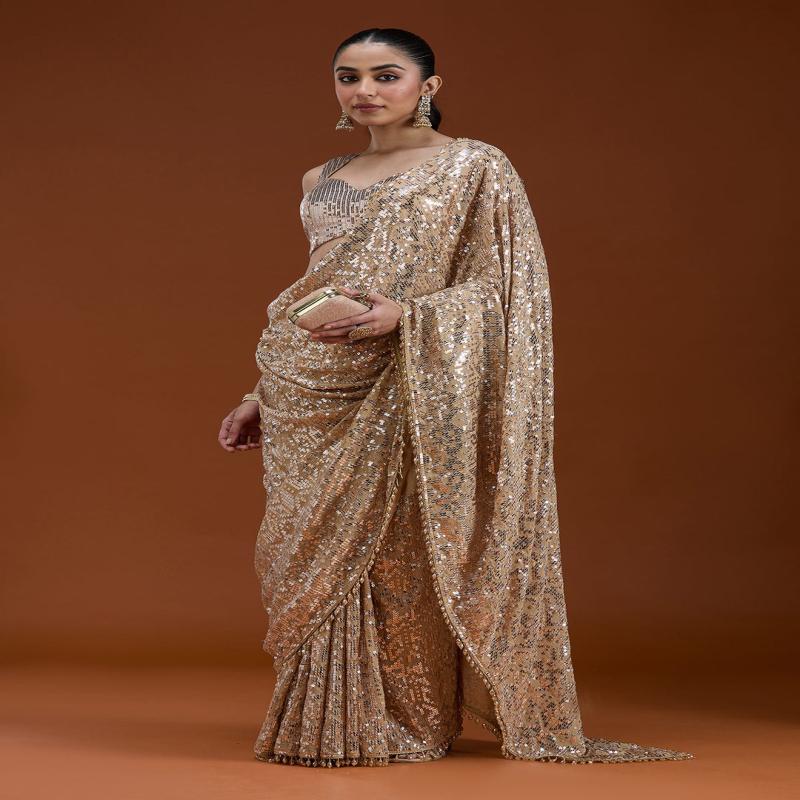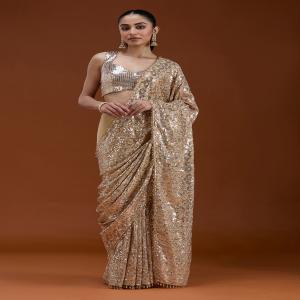 Beige Saree in Georgette fabric. The Saree is elevated with Sequins embroidery. It comes with an Unstitched blouse. Comes with the Koskii promise of premium quality.