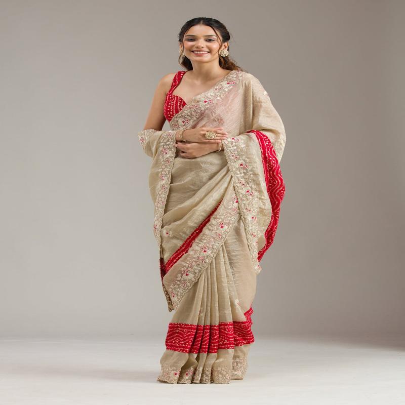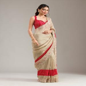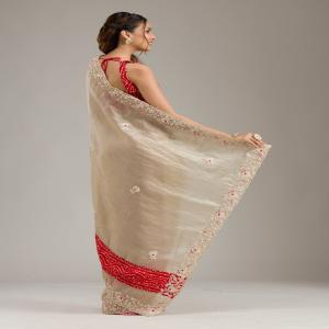 Beige Saree in Organza fabric The Saree is elevated with Zariwork (Gold) embroidery It comes with an Unstitched blouse Comes with the Koskii promise of premium quality.