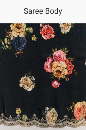 Black Crepe Saree With Floral Digital Print And Sequin Border