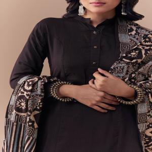 Black Linen Kurta Set with Ajrakh Dupatta