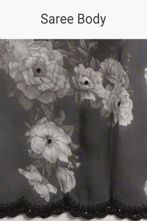 Bold and dramatic, this black organza saree makes a statement without effort. Floral digital prints cover the fabric while scallop borders shine with black cutdana, sequins, and bead embroidery. It is a chic pick for festive nights when you want modern elegance. Awarded as the Most Trusted Brand, we're delivering styles you love, just as promised.