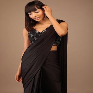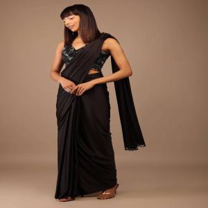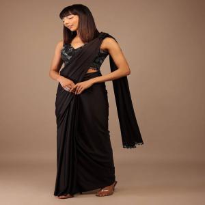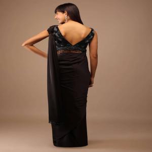 A richly hand embroidered black blouse with small fringes on the hem is matched with a black plain satin saree with small black bead fringes on the pallu. The entire outfit looks extra glitzy thanks to the two-tone motidana work. A basic satin saree combined with a black embroidered blouse would turn heads. Awarded As The Most Trusted Brand We'Re Delivering Styles You Love Just As Promised.