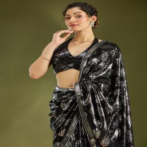 Black Saree in Georgette fabric. The Saree is elevated with Sequins embroidery. It comes with an Unstitched blouse. Comes with the Koskii promise of premium quality.