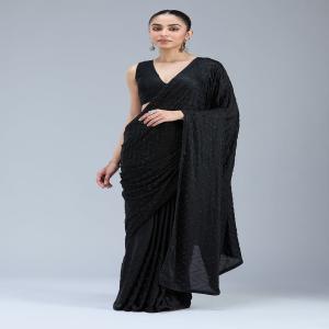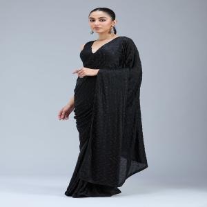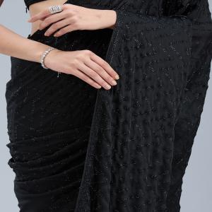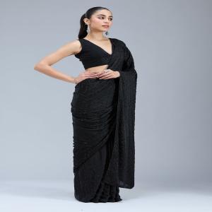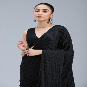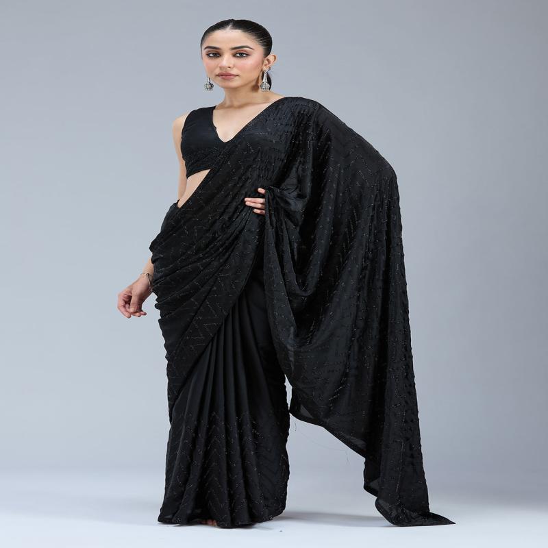 Black Saree in Organza fabric. The Saree is elevated with Stonework (Silver) embroidery. It comes with an Unstitched blouse. Comes with the Koskii promise of premium quality.
