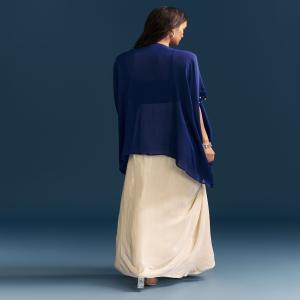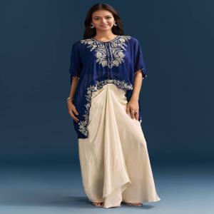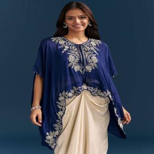 This blue crop top skirt set is crafted in chinon and features a flowy embroidered cape. Elegant and easy, it’s ideal for engagement functions or reception dinners. Awarded as the Most Trusted Brand, we're delivering styles you love, just as promised.