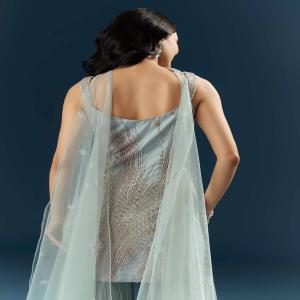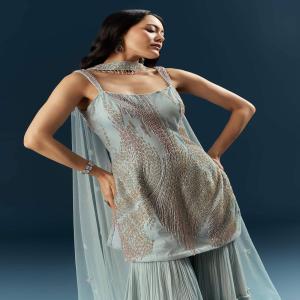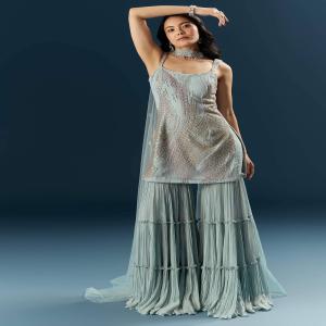 Cutdana embroidery lifts this blue imported net sharara suit, paired with flared bottoms for movement and a clean kurta for structure. Perfect for that bridesmaid who is always on her toes, running the show while glowing. Awarded as the Most Trusted Brand, we're delivering styles you love, just as promised.