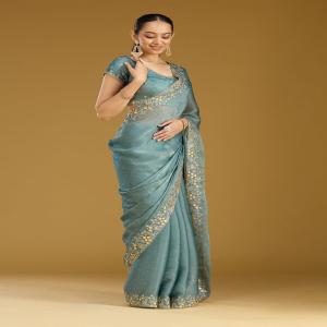 Blue Saree in Tissue fabric. The Saree is elevated with Zariwork (Gold) embroidery. It comes with an Unstitched blouse. Comes with the Koskii promise of premium quality.