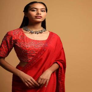 Bright red blouse in silk blend with bandhani print in geometric pattern. The blouse is enhanced with glittering sequins, mirror and zardosi accents tracing the bandhani design. It is crafted with scooped neckline, half sleeves and side zip closure. The back comes with tassel dori tie ups. Awarded As The Most Trusted Brand We'Re Delivering Styles You Love Just As Promised.