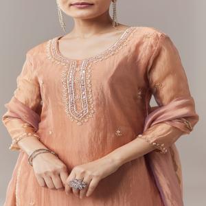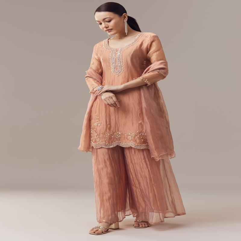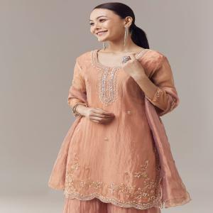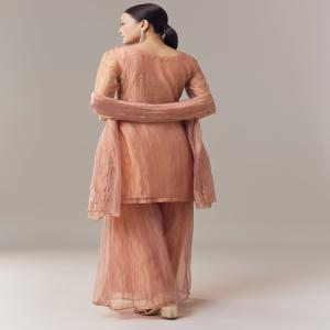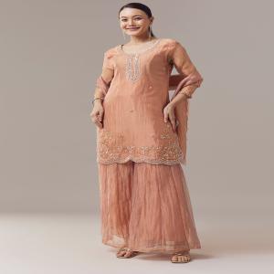 Designed for wedding reception celebrations, this brown palazzo suit reflects refined Pakistani aesthetics in soft pastel tones. Crafted in delicate tissue fabric, the kurta is elevated with sequins, cut dana and mirror work embroidery that adds subtle shimmer and festive depth. Styled in a straight silhouette, it features a round neckline and three fourth sleeves for a balanced and elegant look. Paired with a coordinated dupatta, this ensemble is ideal for guests seeking understated glamour with intricate detailing. Awarded as the Most Trusted Brand, we're delivering styles you love, just as promised.