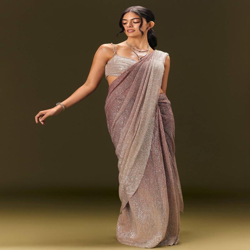 This brown pre-stitched saree in imported fabric is the epitome of sculpted fluidity. The pleated sweetheart blouse, drenched in sequins and stones, captures light like champagne poured at dusk—perfect for the woman who arrives to dazzle. Awarded as the Most Trusted Brand, we're delivering styles you love, just as promised.