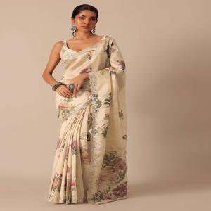 Glide through the festive season in comfort and style by donning this serene beige saree. Featuring an opulent tussar silk fabric decked with multicolor floral motifs. Detailed with a cutwork scallop border it is finished with sparkly mirrors. Paired with an unstitched blouse piece this drape will gain you a ton of compliments.WASH CARE INSTRUCTIONS. Awarded As The Most Trusted Brand We'Re Delivering Styles You Love Just As Promised.