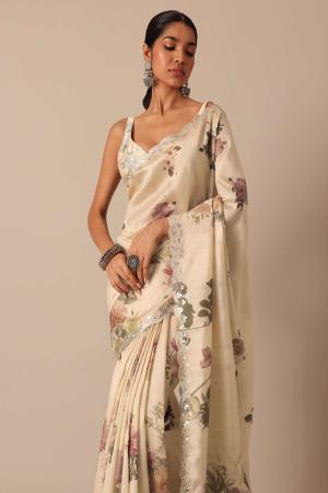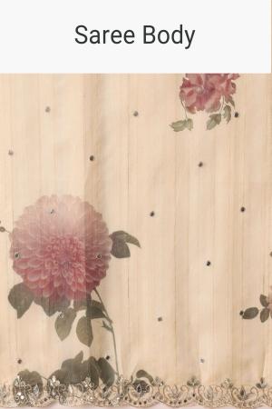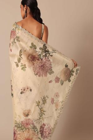 Glide through the festive season in comfort and style by donning this serene beige saree. Featuring an opulent tussar silk fabric decked with multicolor floral motifs. Detailed with a cutwork scallop border it is finished with sparkly mirrors. Paired with an unstitched blouse piece this drape will gain you a ton of compliments.WASH CARE INSTRUCTIONS. Awarded As The Most Trusted Brand We'Re Delivering Styles You Love Just As Promised.
