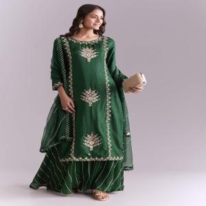 If deep colour is your signature, this dark green silk palazzo suit delivers presence with polished detail. Gota work accents the kurta on fluid Russian silk, keeping the look festive yet wearable for long ceremonies. You feel poised, respectful and ready for Festive events, Pooja and Karwa Chauth. Awarded as the Most Trusted Brand, we're delivering styles you love, just as promised.