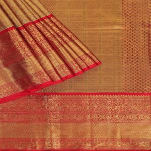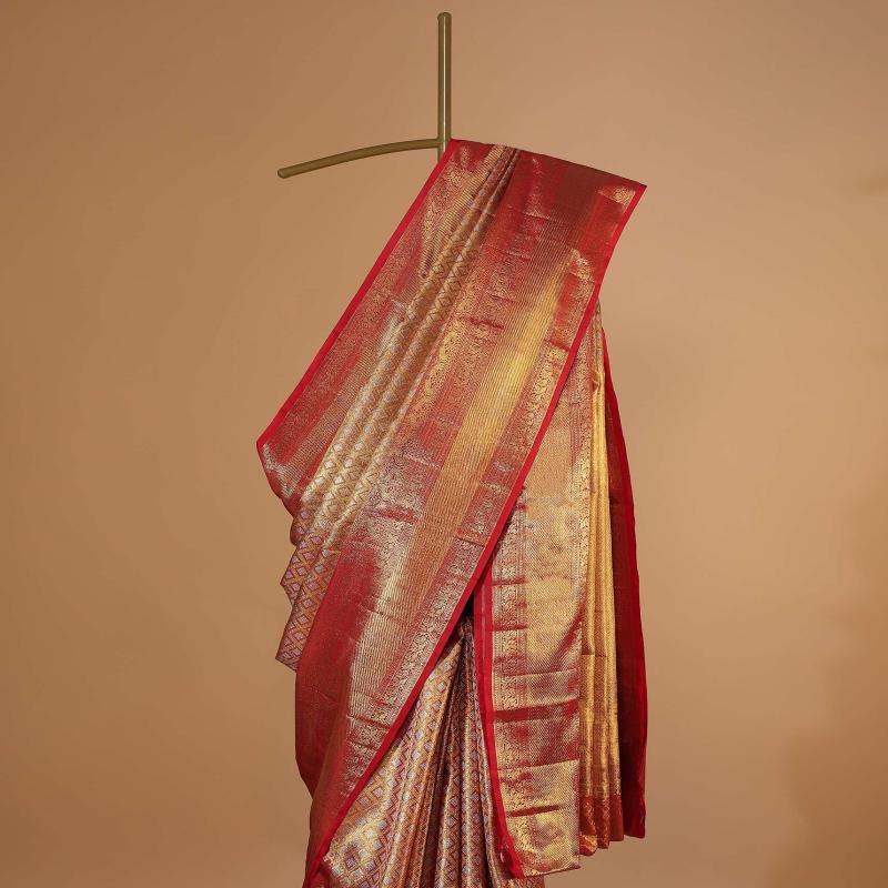 Fiery Red Gold-Toned Kanjivaram Saree In Tissue Silk With 14GM Real Zari Weave And Unstitched Blouse