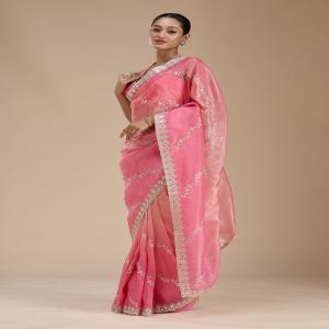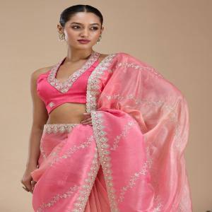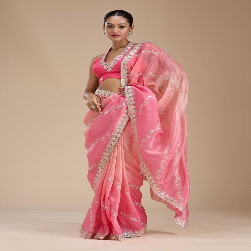 Gajari Pink Saree in Crepe fabric. The Saree is elevated with Gotapatti embroidery. It comes with an Unstitched blouse. Comes with the Koskii promise of premium quality.