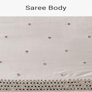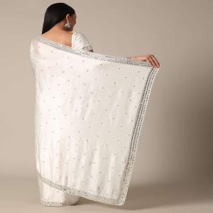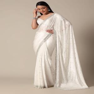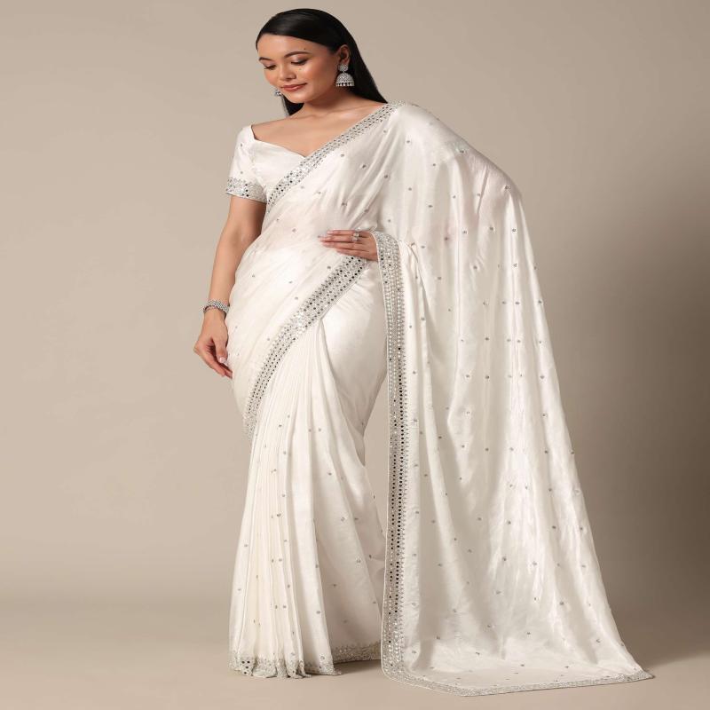 Indulge in the timeless charm of this Satin Chinnon Saree. It is adorned with stone embellishments and a mesmerizing mirror border. The luxurious white hue enhances the crepe fabric, creating a sophisticated and stylish ensemble. This saree comes with an unstitched blouse. Awarded as the Most Trusted Brand, we're delivering styles you love, just as promised.