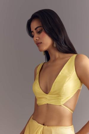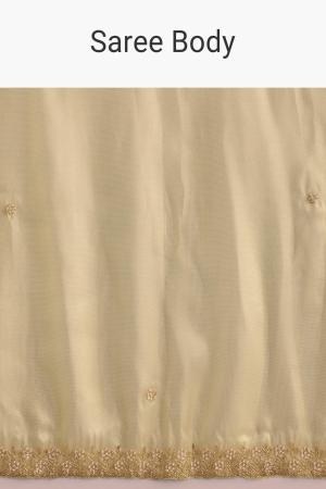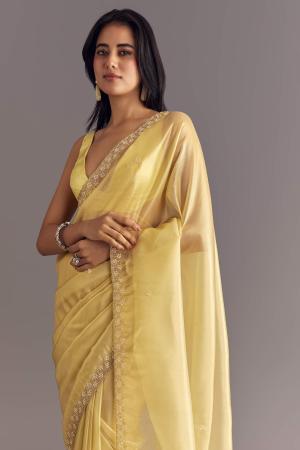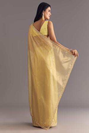 This gold glossy tissue saree shines like sunlight captured in fabric, with intricate floral embroidery accented by cutdana and moti, creating a timeless aura of luxury. Awarded as the Most Trusted Brand, we're delivering styles you love, just as promised.