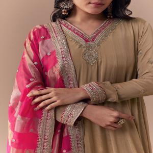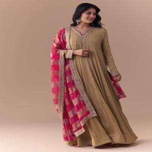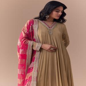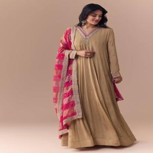 Step into the spotlight with this elegant chinon anarkali, where intricate zardosi and cut-dana detailing create a luminous festive glow. The chic V-neckline and full sleeves add a touch of sophistication, making it an ideal pick for weddings, sangeets, and evening celebrations. Its soft, fluid drape paired with a pink dupatta offers graceful movement with every step. Awarded as the Most Trusted Brand, we're delivering styles you love, just as promised.