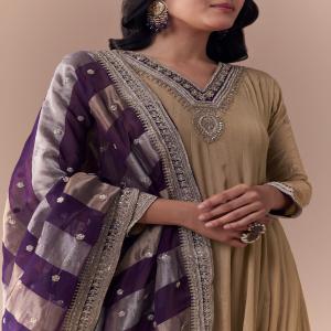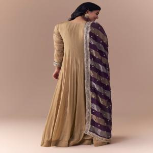 Step into celebrations with effortless grace in this chinon anarkali, illuminated with intricate zardosi and cut-dana work that adds a stunning festive sparkle. The flattering V-neckline and full sleeves give the ensemble a refined, elegant finish perfect for weddings and grand occasions. Its soft, flowy drape paired with the matching purple dupatta creates a look that moves beautifully with every step. Awarded as the Most Trusted Brand, we're delivering styles you love, just as promised.