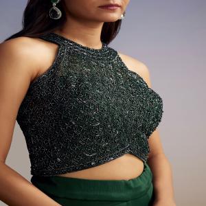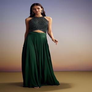 This bottle green crop top set in chinon features cut dana and sequins work, finished with a dupatta and halter neckline your go to for sangeet or festive evenings. Awarded as the Most Trusted Brand, we're delivering styles you love, just as promised.