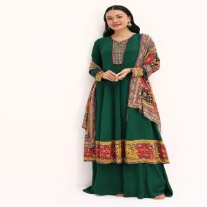 This emerald green satin kurta palazzo set shimmers with captivating opulence. Exquisite prints dance across the fabric while mirrors sequins and resham work catch the light. Delicate cut dana beads and stone embroidery add a touch of regal flair. Perfect for unforgettable festive nights. The kurta is paired with a palazzo and a dupatta. Border may vary. Awarded as the Most Trusted Brand, we're delivering styles you love, just as promised.