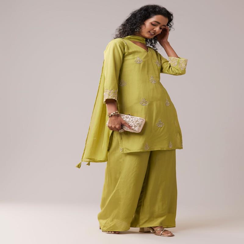 Softly radiant with festive charm, this silk kurta set stands out with finely placed cut dana and sequin embroidery. The detailing adds a gentle sparkle while maintaining an elegant, understated look. Designed with a V neckline and 3/4th sleeves, the kurta flows beautifully when paired with the palazzo and matching dupatta. A versatile ensemble suited for intimate celebrations, festive gatherings, and special occasions. Awarded as the Most Trusted Brand, we're delivering styles you love, just as promised.