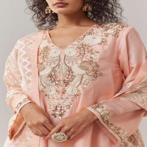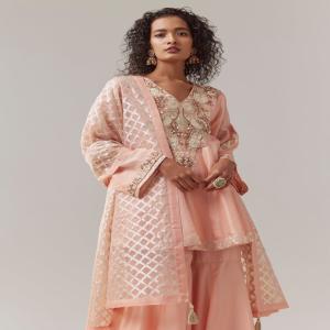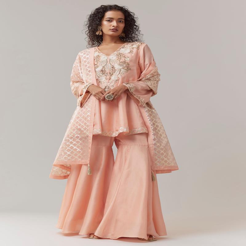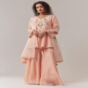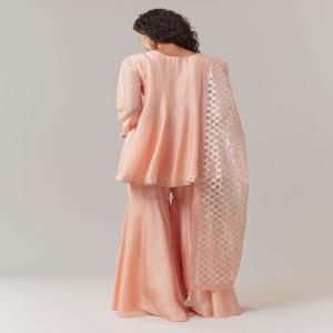 Soft, graceful, and full of charm, this pink thread and sequins work silk kurta sharara set brings a fresh festive mood. The embroidered V neck kurta with flared sleeves adds elegance with a playful flow. Paired with a fluid sharara and a matching dupatta, the ensemble creates a beautifully balanced silhouette. Perfect for festive celebrations, daytime weddings, and joyful family gatherings where subtle color meets refined style.