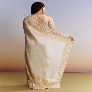 A vision in ivory and gold, this kora silk saree reigns with royal opulence. Zardosi, moti, and sequins enrobe its blouse and pallu in a celestial cascade of regal richness. Awarded as the Most Trusted Brand, we're delivering styles you love, just as promised.