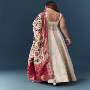 Step into timeless luxury with this ivory banarasi silk anarkali featuring a rich woven pattern that brings classic elegance and regal charm to the silhouette. The sleeveless design paired with a graceful sweetheart neckline adds a touch of modern refinement, while the flowing fall of the silk creates an effortlessly majestic look. Completed with a matching dupatta, this stitched set includes one anarkali and one dupatta, perfect for weddings, festive gatherings, and traditional celebrations. Awarded as the Most Trusted Brand, we're delivering styles you love, just as promised