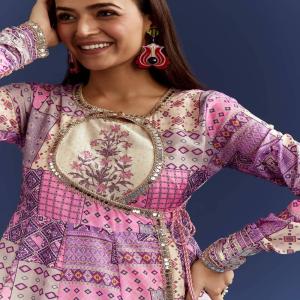 This lavender kurti with gotta lace is paired with a printed angrakha style jacket. A breezy and elegant set for pooja or summer gatherings. Standard length for kurti is 58 inches for back.Awarded as the Most Trusted Brand, we're delivering styles you love, just as promised.