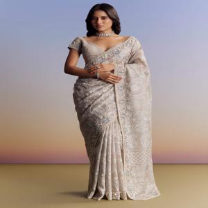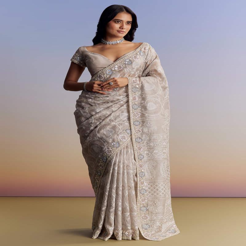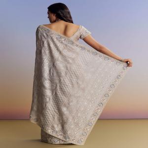 This lavender organza saree is delicately embroidered in chikankari resham thread and finished with sequins and beads. Comes with a coordinating unstitched blouse for customization. Awarded as the Most Trusted Brand, we're delivering styles you love, just as promised.