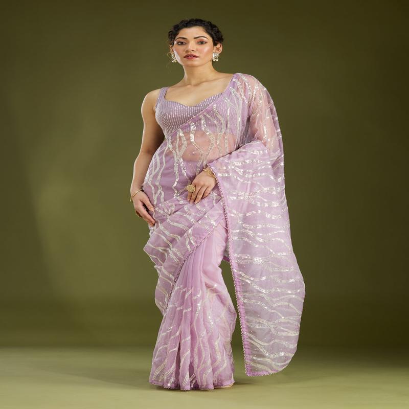 Lavender Saree in Organza fabric. The Saree is elevated with Pearlwork embroidery. It comes with an Unstitched blouse. Comes with the Koskii promise of premium quality.