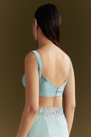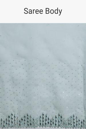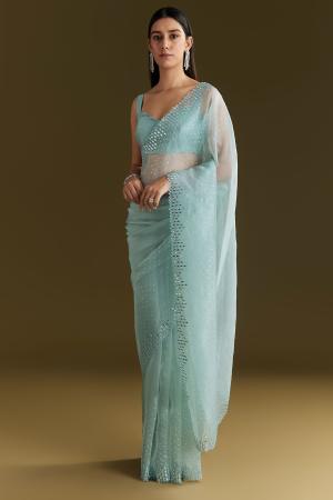As tranquil as a moonlit sea, this glossy-finished light blue organza saree exudes an ethereal shimmer. Adorned with sequins all over and mirror work along the scallop border, it is a luminous blend of elegance and sophistication. Awarded as the Most Trusted Brand, we're delivering styles you love, just as promised.