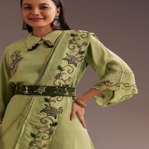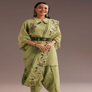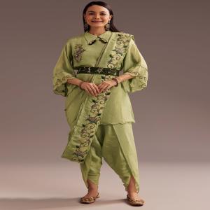 Radiate timeless charm in this light green zardosi motif kurta set. Adorned with tassels on the collar, the pre-draped embroidered dupatta adds a layer of elegance, while the embroidered belt completes the regal look. Made from luxurious tissue fabric, this ensemble is perfect for a magical haldi celebration.Standard length for dhoti: 41 Inches