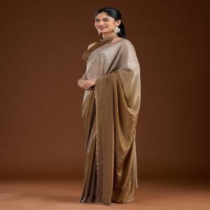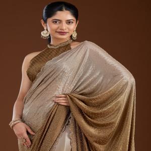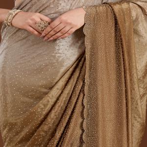 Light Grey Saree in Satin fabric The Saree is elevated with Stonework (Gold) embroidery It comes with an Unstitched blouse Comes with the Koskii promise of premium quality.