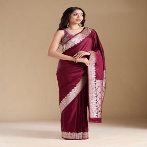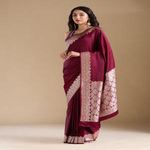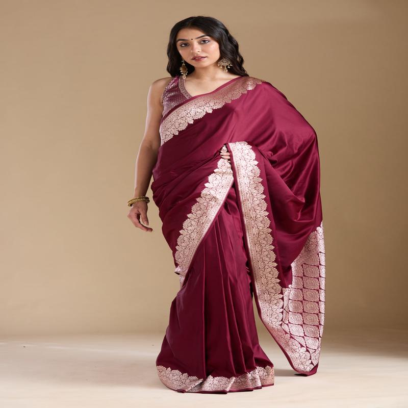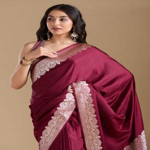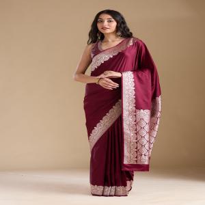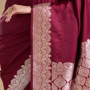 Maroon Silk Saree in Banarasi fabric. The Silk Saree is elevated with Zariwork (Gold) embroidery. It comes with an Unstitched blouse. Comes with the Koskii promise of premium quality.