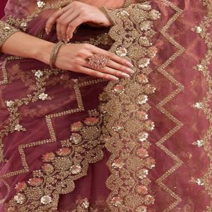 Swirl into the spotlight with Koskii's exquisite mauve net saree, where traditional cording embroidery meets modern elegance! This piece, crafted from diaphanous net fabric, is adorned with a cascade of detailed golden embroidery, promising not just a garment, but a grand statement. Perfect for infusing a touch of glamour into every gathering, this saree celebrates the lush textures and vibrant self-expression that every stylish woman adores.