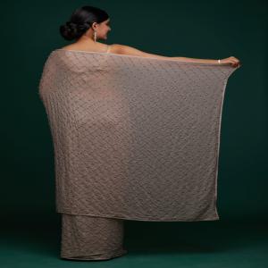Step into the spotlight with Koskii's exquisite beige satin saree, where luxury meets playfulness. This stunning ensemble boasts meticulous pearlwork embroidery that cascades elegantly over the luscious satin fabric, promising to turn heads at every corner. Perfect for those who love to express their vibrant personality and charm, this saree combines timeless elegance with a touch of contemporary flair, making it the ultimate choice for any evening soirée.