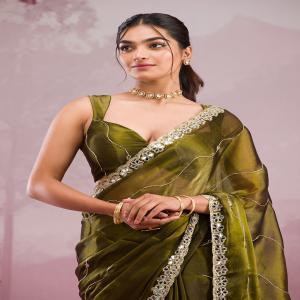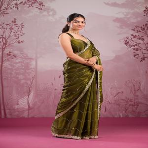 Drape yourself in the luxurious folds of Koskii's Olive Green Organza Saree, where traditional craftsmanship meets contemporary flair! This exquisite saree sparkles with vibrant mirrorwork embroidery that dances playfully across the sheer, whisper-light organza, creating an allure that's impossible to resist. It's a celebration of grace and a testament to the spirited elegance that Koskii brings to every piece. Perfect for those who love to express their style with confidence and vivacity!.