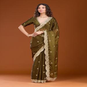 Mehendi Saree in Tissue fabric. The Saree is elevated with Zariwork (Gold) embroidery. It comes with an Unstitched blouse. Comes with the Koskii promise of premium quality.