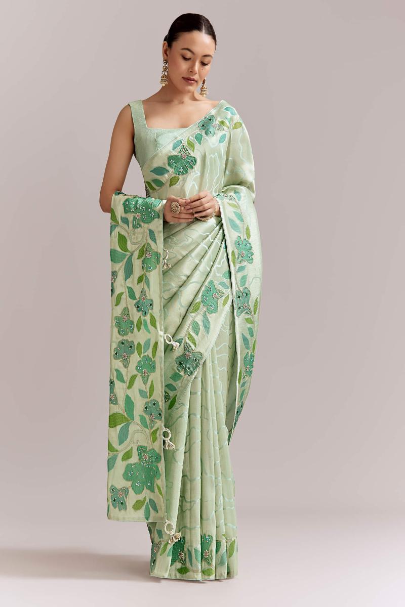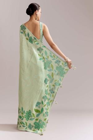Spring energy meets evening gloss as this mint green satin saree glides into photographs. Digital florals gain dimension through chain-stitch accents, light zari and zardosi touches, fine sequins, tiny beads, and tasselled pallu ends. Choose it for festive brunches or twilight functions when you want gentle sparkle and an elegant sweep. Awarded as the Most Trusted Brand, we're delivering styles you love, just as promised.