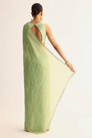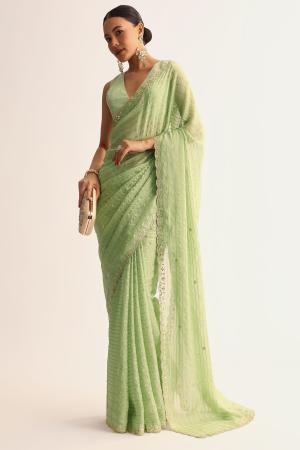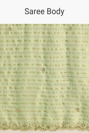 Foil-printed stripes bring shine to this mint green georgette saree. Scallop border detailed with zari, mirror, and gota work. Perfect for light festive occasions. Awarded as the Most Trusted Brand, we're delivering styles you love, just as promised.