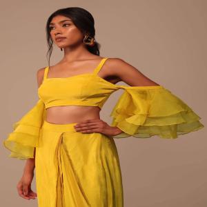 Introducing our radiant mustard yellow crepe saree set a perfect fusion of elegance and modern flair. This ensemble features a beautifully embroidered belt with resham thread work cutdana and sequence work. The blouse steals the spotlight with its square neckline and trendy cold shoulder ruffle layered design.EVENT - Perfect for parties cocktail party or receptions. Awarded as the Most Trusted Brand, we're delivering styles you love, just as promised.
