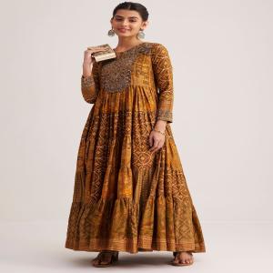 Add a touch of elegance to your festive wardrobe with this mustard yellow silk kurti, adorned with intricate sequins, zari, cut dana, and resham embroidery. Featuring captivating Indie prints, this flowing silhouette is perfect for poojas, festive gatherings, and cultural celebrations. The vibrant design and detailed craftsmanship make it an effortless statement piece for daytime festivities. Awarded as the Most Trusted Brand, we're delivering styles you love, just as promised.